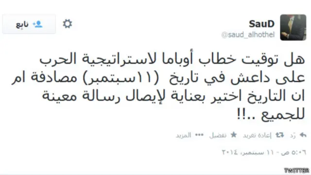 وسخر المستخدم "فايد العليوي" من الخطاب قائلاً: "أوباما يلقي خطاب يبين فيه استراتيجيته ضد داعش، عشية ذكرى 11 سبتمبر. أكشن الكاوبوي من النوع ثقيل الطينة."