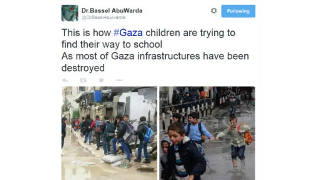 ونشر طبيب وناشط إنساني في غزة يدعى باسل ابو وردة عبر حسابه على تويتر صورا تظهر أطفال يحاولون الذهاب إلى مدرستهم في الشوراع الغارقة، وقال معلقا عليها "هذا هو حال الأطفال خلال رحلتهم اليومية إلى المدرسة، في مدينتهم التي دمرت معظم بنيتها التحتية".