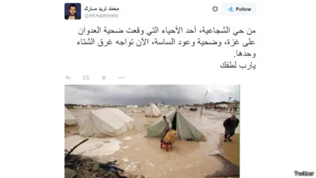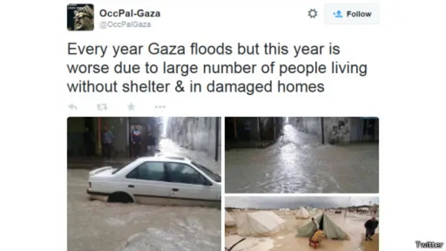 وغرد حساب يدعى @OccPalGaza صورا أخرى للسيول التي غمرت الشوارع، وأشار إلى ان هذه الأمطار تحدث سنويا، ولكن نتيجة للحرب الأخيرة التي شنتها إسرائيل على المدينة، كان للأمطار تأثير أسوأ نظرا لعدد المواطنين الذين دمرت منازلهم.