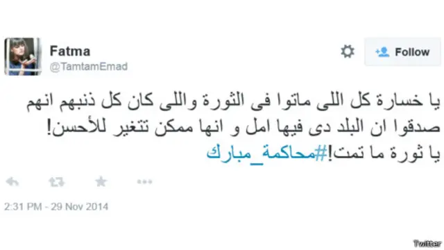 وعبر آخرون عن غضبهم من الحكم، ورأوا أنه "نهاية للثورة المصرية"، و"ضياع لحق شهداءها"، وعلقت مستخدمة تدعى "فاطمة" في تغريدة لها عبر حسابها على تويتر قائلة "يا خسارة كل اللى ماتوا فى الثورة واللى كان كل ذنبهم انهم صدقوا ان البلد دي فيها امل وأنها ممكن تتغير للأحسن! يا ثورة ما تمت!"