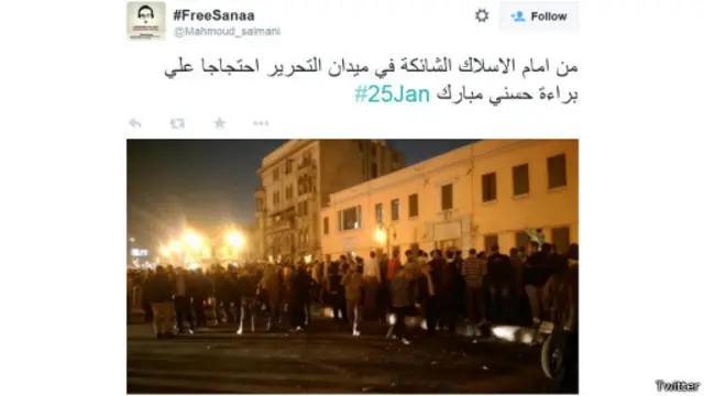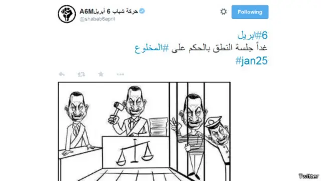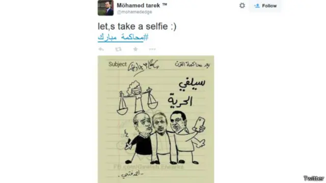 وغرد مستخدم يدعى محمد طارق صورة كاركاتيرية تظهر مبارك ووزير داخليته حبيب العدلي ومحاميه فريد الديب وهم يلتقطون "سيلفي الحرية" احتفالا بنطق المحكمة، التي لم تجز الدعوة ضد مبارك، وبرأت حبيب العدلي من تهمة قتل المتظاهرين.