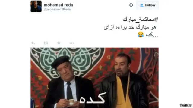 بينما نشر حساب آخر صورة للقطة من الفيلم المصري الكوميدي الشهير "اللمبي"، ساخرا من كيفية "تبرئة مبارك".