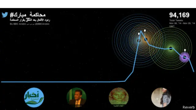 وظهر هاشتاغ #محاكمة_مبارك في أكثر من 80 ألف تغريدة على مدار الأربع وعشرين ساعة الماضية، <link type="page"><caption> وإليكم تحليلا لردود الأفعال في تسلسل زمني بواسطة موقع Reverb عبر تويتر.</caption><url href="http://reverb.guru/view/155020513656553840" platform="highweb"/></link>