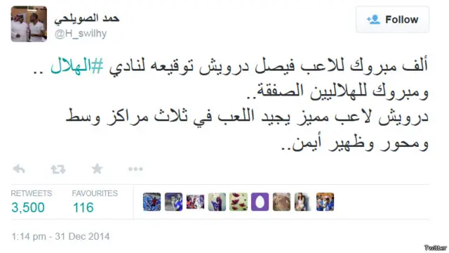 وعبر "حمد الصويلحي" عن فرحته العارمة بتعاقد الهلال مع "درويش" :"ألف مبروك للاعب فيصل درويش توقيعه لنادي #الهلال .. ومبروك للهلاليين الصفقة..."