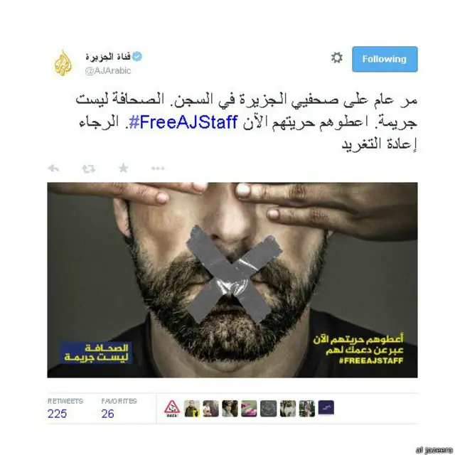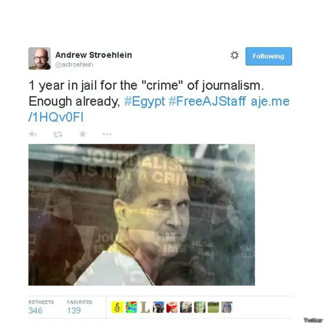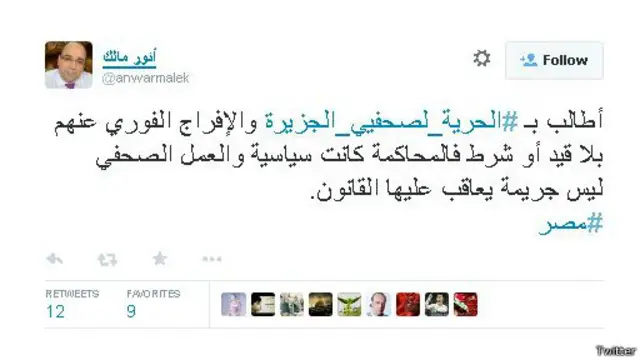 فكتبت المغردة "ندى"#الحرية_لصحفيي_الجزيرة #FreeAJstaff أن تكون صحفياً ليست جريمة .. " وأضاف المستخدم "أنور مالك " :أطالب بـ #الحرية_لصحفيي_الجزيرة والإفراج الفوري عنهم بلا قيد أو شرط فالمحاكمة كانت سياسية والعمل الصحفي ليس جريمة يعاقب عليها القانون. #مصر"