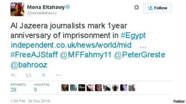 و كتبت الناشطة المصرية "منى الطحاوي" باللغة الانجليزية تغريدة طالبت فيها بالافراج الفوري عن الصحافيين وكذلك فعل مدير منظمة "هيومن رايتس ووتش"
