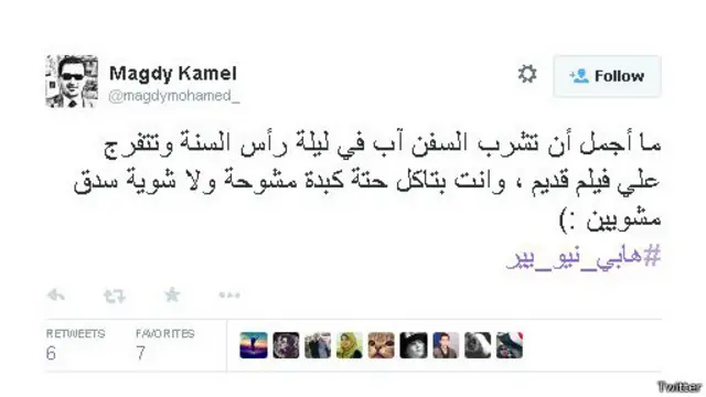 ولم تخل تغريدات المستخدمين من روح الفكاهة، فكتب المستخدم "مجدي كامل ": ما أجمل أن تشرب "السفن آب"في ليلة رأس السنة وتتفرج علي فيلم قديم ، وانت بتاكل حتة كبدة مشوحة ولا شوية سدق مشويين :) #هابي_نيو_يير"