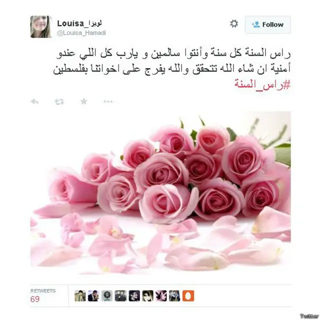 بينما خصت المستخدمة "هالة القصير" من الجزائر أهل سوريا بالتحية بمناسبة رأس السنة،فكتبت : "إن شاء الله تكونوا عم تقضوا أيام #رأس_السنة بخير. يسعد أوقاتكم أحلى ناس نحبكم بزاف. #سوريا_الجزائر_بلدواحد." وأضافت المستخدمة "لويزا" في حسابها على تويتر: "رأس السنة. كل سنة وإنتوا سالمين ويا رب كل اللي عنده أمنية إن شاء الله تتحقق، والله يفرج على إخواتنا بفلسطين #رأس_السنة."