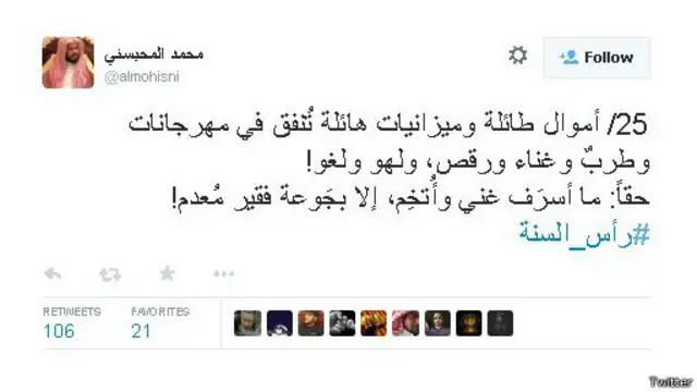 وانتقد جانب آخر من المعلقين الأموال التي تنفق على احتفالات رأس السنة و التي وصفها بـ "الطائلة".فكتب "محمد المحيس ني" : "أموال طائلة وميزانيات هائلة تُنفق في مهرجانات وطربٌ وغناء ورقص، ولهو ولغو! حقاً: ما أسرَف غني وأُتخِم، إلا بجَوعة فقير مُعدم! #رأس_السنة."