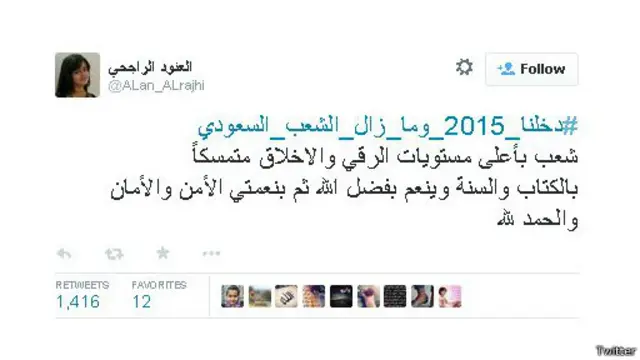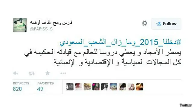 وعبر السعوديون من خلال الهاشتاغات عن أهم الانجازات التي حققها الشعب السعودي، فكتب "فارس رمح الله" مفتخرا ببلاده: " #دخلنا_2015_وما_زال_الشعب_السعودي يسطر الأمجاد و يعطي دروسا للعالم مع قيادته الحكيمه في كل المجالات السياسية و الإقتصادية و الإنسانية"