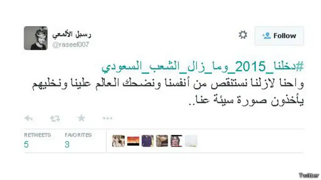 ولكن كانت رؤية المستخدمة "رسيل" مختلفة عن "فارس"، فغردت: " #دخلنا_2015_وما_زال_الشعب_السعودي واحنا لازلنا نستنقص من أنفسنا ونضحك العالم علينا ونخليهم يأخذون صورة سيئة عنا.."