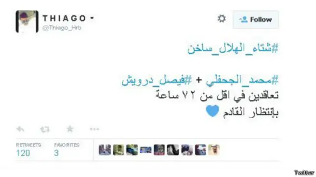 وكتب مستخدم سمى نفسه "ثياغو"-من مشجعي نادي الهلال- مرحبا بانضمام اللاعب إلى نادي الهلال: "#شتاء_الهلال_ساخن #محمد_الجحفلي + #فيصل_درويش عاقدين في اقل من ٧٢ ساعة بإنتظار القادم" وأضاف في تغريدة اخرى: "#فيصل_درويش لاعب مهاري يجيد اللعب بخانتي الظهير والجناح الأيمن #سلمان_الفرج : جوكر يلعب بالقدم اليسرى #فيصل_درويش : جوكر يلعب بالقدم اليمنى"