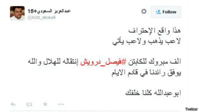 لم يثن الحزن مشجع نادي الرائد "عبد العزيز" عن تقديم التهاني للاعبه السابق بالتحاقه بناديه الجديد، فكتب: "هذا واقع الإحتراف لاعب يذهب ولاعب يأتي الف مبروك للكابتن #فيصل_درويش إنتقاله للهلال والله يوفق رائدنا في قادم الايام ".