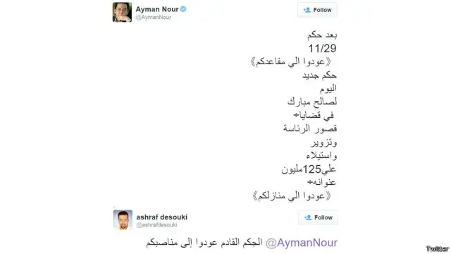 وكتب أيمن نور، رئيس حزب غد الثورة المصري والمرشح السابق للرئاسة، عبر حسابه على تويتر منتقدا الحكم: " بعد حكم 11/29 «عودوا الي مقاعدكم»، حكم جديد اليوم لصالح مبارك في قضايا قصور الرئاسة وتزوير واستيلاء على 125 مليون عنوانه «عودوا الي منازلكم»"، ليرد عليه أشرف دسوقي معقبا: "الحكم القادم عودوا إلى مناصبكم".