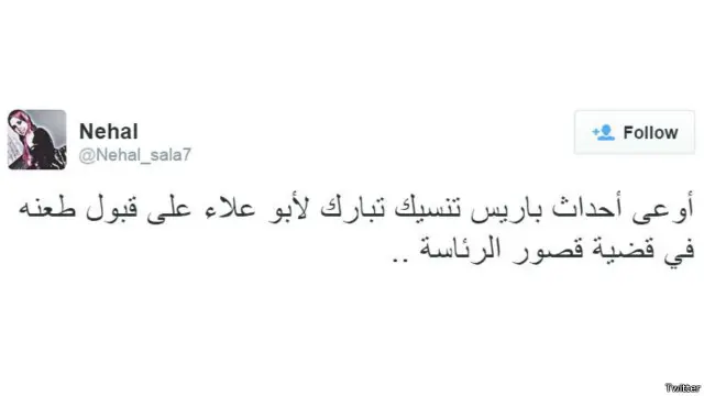 أما نهال صلاح فغردت عبر حسابها على تويتر تقول: "أوعى أحداث باريس تنسيك تبارك لأبو علاء على قبول طعنه في قضية قصور الرئاسة".