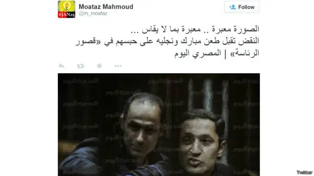 ونشر معتز محمود صورة التقطت لنجلي مبارك: علاء وجمال وهما خلف القضبان، وكتب معلقا: "الصورة معبرة. معبرة بما لا يقاس. النقض تقبل طعن مبارك ونجليه على حبسهم في «قصور الرئاسة»".