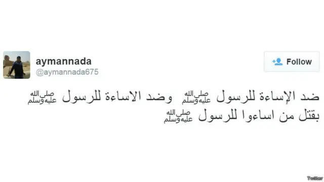 وفي تغريدة له، قال المستخدم عبد الرحمن: "شارلى ايبدو اعادت نشر الصور المسيئة للرسول تأكيدا لحريتهم. للأسف مفهوم الحرية غلط مش بس فى مصر دا فى كل العالم."