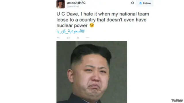 بينما نشر المستخدم @iammrred تغريدة ساخرة، مرفقة بصورة لزعيم كوريا الشمالية كيم جونغ أون بدا فيها مستاءا، وقال فيها متحدثا بلسان الزعيم الكوري: "أنا أكره الخسارة أمام منتخب بلد لا تملك أي أسلحة نووية."