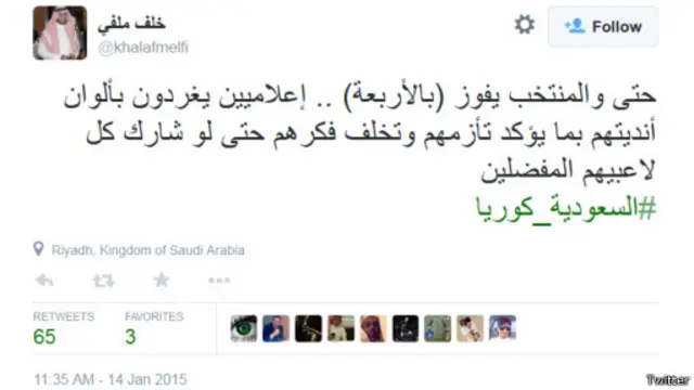 واشار إعلامي آخر يدعى خلف ملفي عبر حسابه على تويتر إلى الخلاف بين مشجعي الأندية السعودية المختلفة حول مشاركة لاعبيهم في مباراة المنتخب أمام كوريا الشمالية، وقال: "حتى والمنتخب يفوز بالأربعة، إعلاميون يغردون بألوان أنديتهم بما يؤكد تأزمهم وتخلف فكرهم حتى لو شارك كل لاعبيهم المفضلين."