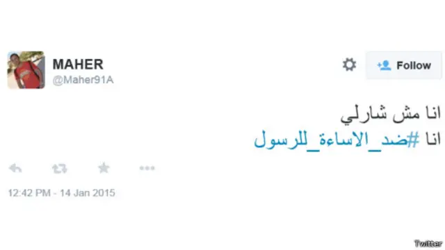 وعبر الهاشتاغ، غرد المستخدم ماهر قائلا: "انا مش شارلي انا #ضد_الاساءة_للرسول".