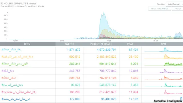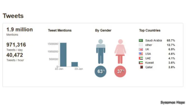 وكان أبرز الهاشتاغات وأكثرها انتشارا هو هاشتاغ بعنوان #وفاة_الملك_عبدالله، الذي ظهر في أكثر من 1.9 مليون تغريدة، منذ أن ذاع خبر وفاة الملك عبدالله مساء الخميس، وإليكم تحليلا يظهر أكثر الدول استخداما للهاشتاغ.