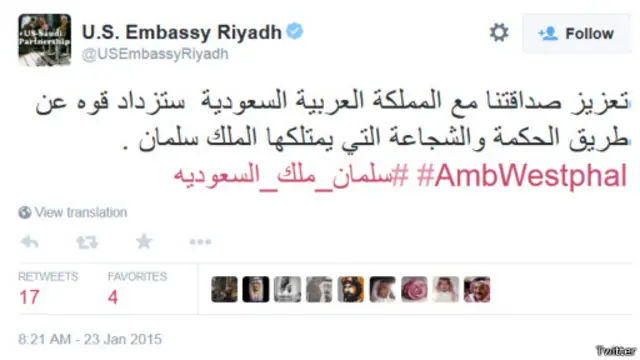 ونُشرت بعدها تغريدة آخرى من السفارة الأمريكية تصف ولي العهد سلمان بن عبد العزيز، الذي يخلف الملك عبدالله، بالـ"شجاع" والـ"حكيم" في حكم البلاد، وأعلنت فيها السفارة عن ثقتها في الأمير سلمان بتعزيز العلاقات الثنائية بين البلدين، وقرأت التغريدة: "تعزيز صداقتنا مع المملكة العربية السعودية ستزداد قوه عن طريق الحكمة والشجاعة التي يمتلكها الملك سلمان".