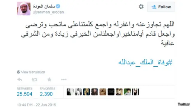 وكانت من أكثر التغريدات انتشارا عبر هاشتاغ #وفاة_الملك_عبدالله تغريدة للداعية السعودي سلمان العودة، والتي تداولها المغردون أكثر من 26 ألف مرة، وقال فيها العودة: "اللهم تجاوز عنه واغفر له واجمع كلمتنا على ما تحب وترضى واجعل قادم أيامنا خيرا واجعلنا من الخير في زيادة ومن الشرفي عافية".