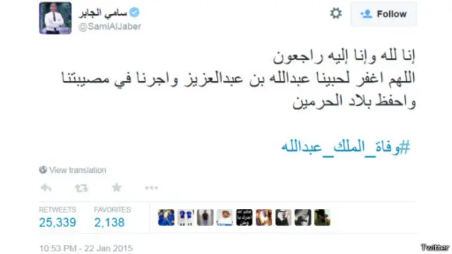 وانتشرت بشكل كبير تغريدة أخرى للاعب كرة القدم السعودي السابق سامي الجابر، وتم تداولها أكثر من 25 ألف مرة على تويتر منذ نشرها مساء الخميس، والتي قال فيها: "إنا لله وإنا إليه راجعون اللهم اغفر لحبينا عبدالله بن عبد العزيز واجرنا في مصيبتنا واحفظ بلاد الحرمين".