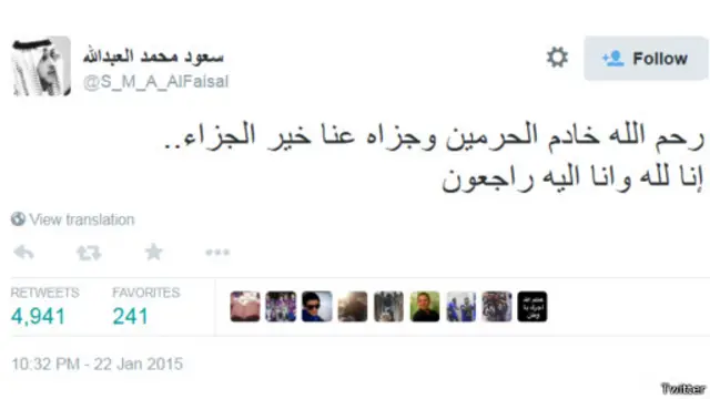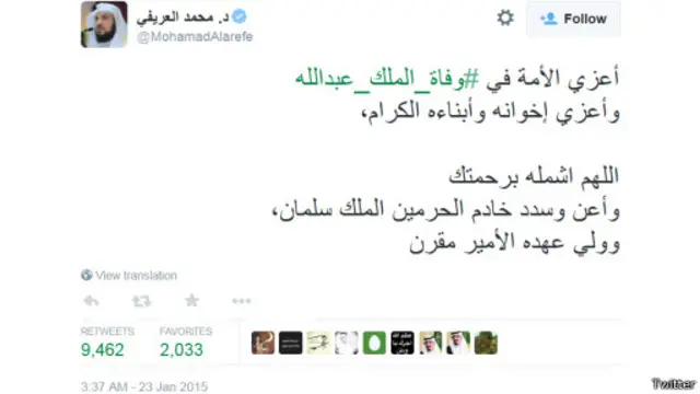 ونعى أيضا الداعية السعودي محمد العريفي الملك عبدالله في تغريدة له، على الرغم من سجن العريفي مؤخرا نظرا لانتقاداته للحكومة، وتداولت اكثر من تسعة آلاف مرة، وقال فيها: "أعزي الأمة في وفاة الملك عبدالله وأعزي إخوانه وأبناءه الكرام، اللهم اشمله برحمتك وأعن وسدد خادم الحرمين الملك سلمان، وولي عهده الأمير مقرن".