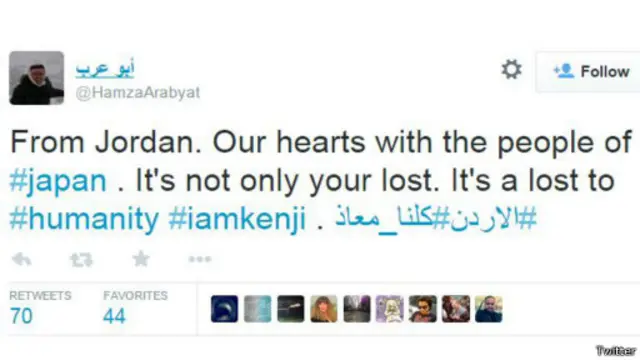 فكتب "ابو عرب" بالإنجليزية يقول: "قلوبنا هنا في الاردن مع اليابانيين، كينجي ليس فقيدكم فقط وإنما فقيد الانسانية".