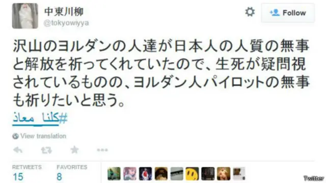 ونشر حساب باسم "@tokyowiyya" تغريدة باللغة اليابانية تفيد بأن صاحب الحساب سيصلي من اجل سلامة معاذ لأنه يدري أن الكثير من الاردنيين كانوا يصلون من أجل سلامة كينجي غوتو".
