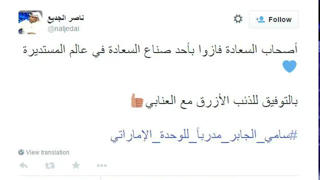 كما حظيت أنباء عن ترشح نجم كرة القدم السعودي السابق سامي الجابر لتدريب نادي الوحدة الإماراتي باهتمام عدد كبير من المغردين في السعودية والإمارات، مستخدمين هاشتاغ #سامي_الجابر_مدرباً_للوحدة_الإماراتي.