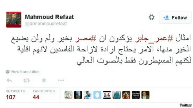 كما كتب محمود رفعت: "أمثال #عمر_جابر يؤكدون أن #مصر بخير ولم ولن يضيع الخير منها، الأمر يحتاج إرادة لإزاحة الفاسدين لأنهم أقلية لكنهم المسيطرون فقط بالصوت العالي"