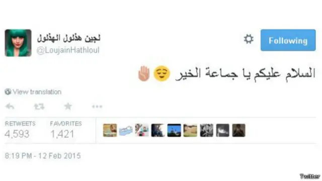 ونشرت الناشطة لجين الهذلول تغريدة ألقت من خلالها التحية على متابعيها في موقع توتير.