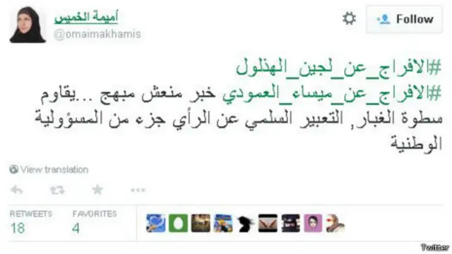وأضاف مغرد أطلق على نفسه لقب " تحدي صريح" :#الإفراج_عن_لجين_الهذلول_وميساء_العموديخبر احزنني كثيرا. لا تنفع الطيبة مع هؤلاء. يجب وضع حد لهم، يظنون اننا سنتبع رأيهم."