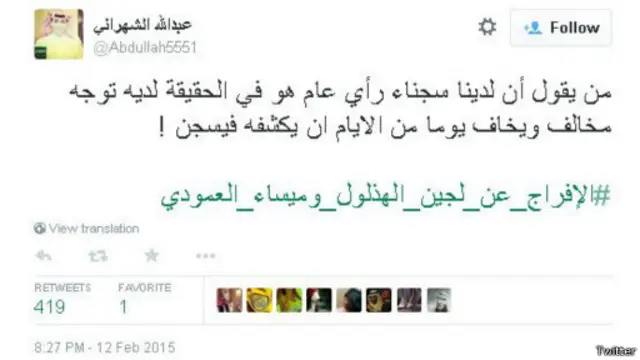 ومن جانبه، علق الاعلامي عبد الله الشهراني بالقول :" من يقول أن لدينا سجناء رأي عام هو في الحقيقة لديه توجه مخالف ويخاف يوما من الايام ان يكشفه فيسجن !#الإفراج_عن_لجين_الهذلول_وميساء_العمودي."