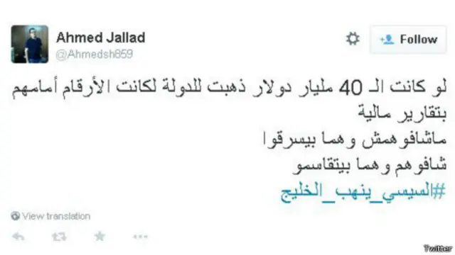 علق المغرد أحمد جلاد على حسابه، قائلا: "لو كانت الـ 40 مليار دولار ذهبت للدولة لكانت الأرقام أمامهم بتقارير مالية. ماشافوهمش وهما بيسرقوا شافوهم وهما بيتقاسمو #السيسي_ينهب_الخليج".