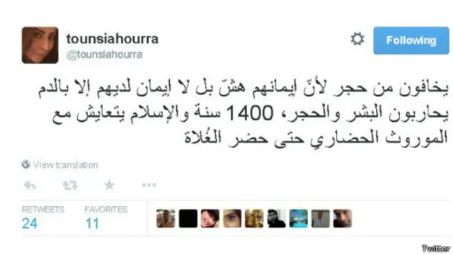 وعلقت الناشطة التونسية "وجد العبد الله" بالقول : " يخافون من حجر لأنّ إيمانهم هشّ، بل لا إيمان لديهم إلا بالدم، يحاربون البشر والحجر. 1400 سنة والإسلام يتعايش مع الموروث الحضاري حتى حضر الغُلاة."