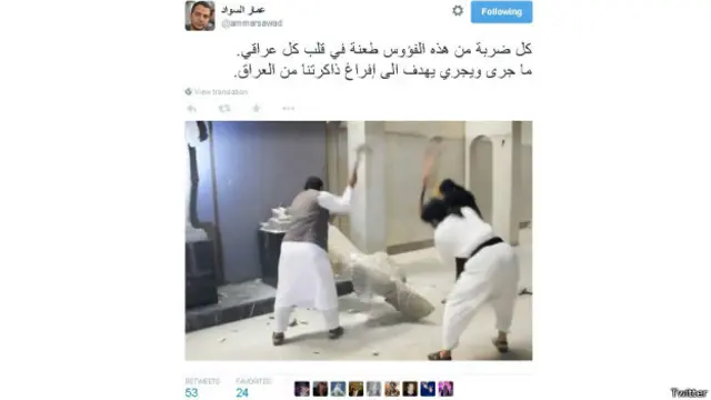 وتعليقا على الموضوع، كتب المدون " عمار السواد" معبرا عن غضبه بقوله: " كل ضربة من هذه الفؤوس طعنة في قلب كل عراقي.ما جرى ويجري يهدف إلى إفراغ ذاكرتنا من العراق."