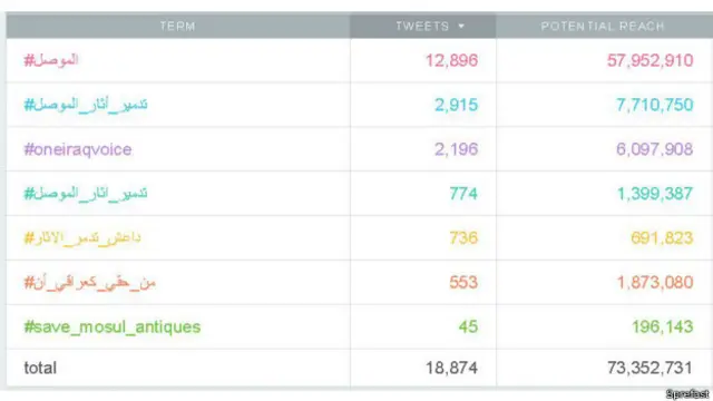حقق هاشتاغ "تدمير أثار الموصل" انتشارا واسعا، إذا ظهر في حوالي 3 ألاف تغريدة. في حين، ظهر هاشتاغ " #الموصل" في أكثر من 12 ألف تغريدة، على مدار الـ24 ساعة الماضية.