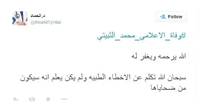 وقال مدون باسم د. حماد: "الله يرحمه ويغفر له، سبحان الله تكلم عن الأخطاء الطبية ولم يكن يعلم أنه سيكون من ضحاياها".