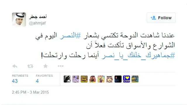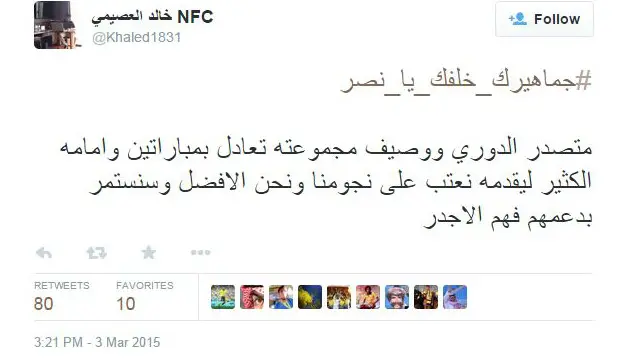 أما أحمد جعفر فكتب عن مشجعي النصر الموجودين في قطر قائلاً: "عندما شاهدت الدوحة تكتسي بشعار النصر في الشوارع والأسواق، تأكدت فعلا أن جماهيرك خلفك يا نصر أينما رحلت وارتحلت".