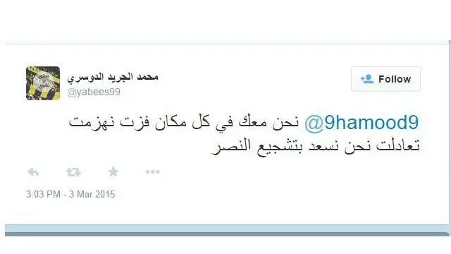 وأكد المدون محمد الجريد الدوسري مساندة الجماهير للفريق معرباً عن سعادته بتشجيع النصر: فقال: "نحن معك في كل مكان، فزت، انهزمت، تعادلت نحن نسعد بتشجيع النصر".