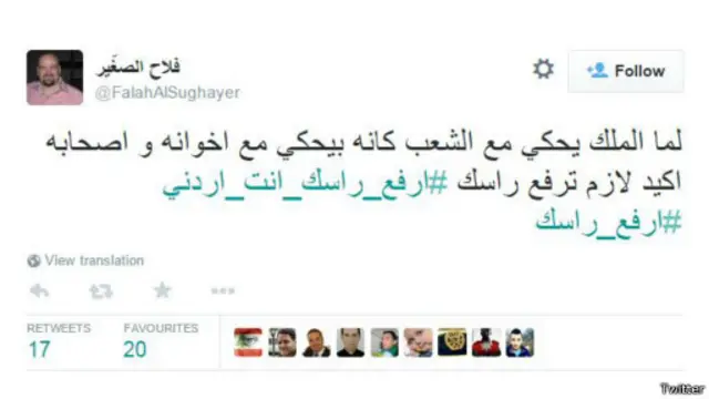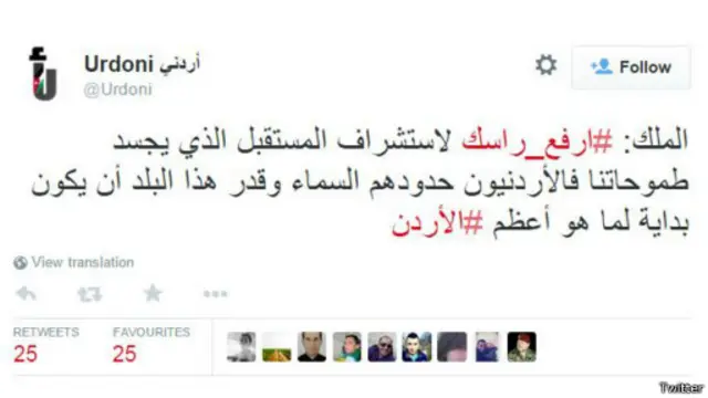 انشغل المغردون في الاردن بهاشتاغ #أردني_رافع_راسي وهاشتاغ #ارفع_راسك اللذين ظهرا في أكثر من 9 آلاف تغريدة في أقل من يوم واحد، وذلك بعد توجيه الملك عبد الله الثاني خطاباً متلفزاً "للأسرة الاردنية الواحدة" مساء يوم الثلاثاء 3 مارس / آذار قال فيه "كل أردني وأردنية أقول: ارفع راسك".