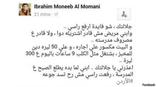 لكن بالمقابل، هناك مدونون أشاروا الى الظروف السيئة التي يعانون منها، متسائلين كيف يمكن رفع رؤسهم في ظلها، أحدهم إبراهيم المعماني الذي كتب: "شو فائدة ارفع رأسي وابني مريض مش قادر اشتري له دواء، ولا قادر على مصروف مدرسته، والبيت مكسور علي اجاره، وعلي 50 ليرة دين للمخبز".