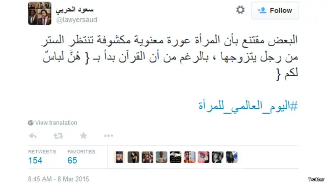 وهناك من استخدم الهاشتاغ لانتقاد نظرة المجتمع العربي للمرأة، فكتب المدون سعود الحربي يقول: "البعض مقتنع بأن المرأة عورة معنوية مكشوفة تنتظر الستر من رجل يتزوجها ، بالرغم من أن القرآن بدأ بـ (هُنَّ لباسٌ لكم)".