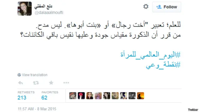 وانتقد البعض الإشارة إلى الصفات الحسنة في المرأة بمقياس ذكوري، فكتبت الكاتبة الكويتية دلع المفتي في هذا السياق تقول: "للعلم، تعبير "أخت رجال" أو "بنت أبوها" ليس مدح. من قرر أن الذكورة مقياس جودة وعليها نقيس باقي الكائنات؟".