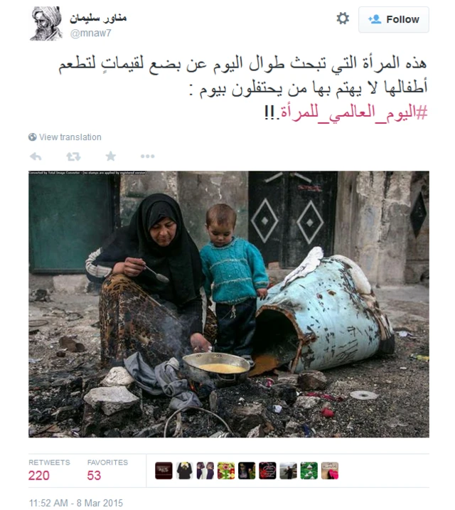 ورأى آخرون أن الاحتفال باليوم العالمي للمرأة يركز على شرائح مجتمعية معينة متجاهلاً النساء اللائي يعانين من الفقر، أحدهم مناور سليمان، الذي نشر صورة وقال: "هذه المرأة التي تبحث طوال اليوم عن بضع لقيماتٍ لتطعم أطفالها لا يهتم بها من يحتفلون بيوم!!".