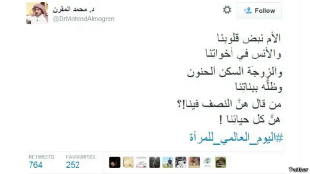 وتداول عدد كبير من المغردين تعليقات تتحدث عن الدور الهام الذي تلعبه المرأة في المجتمعات العربية، أحدهم محمد المقرن الذي كتب: "الأم نبض قلوبنا والأنس في أخواتِنا والزوجة السكن الحنون وظلُّه ببناتِنا من قال هنَّ النصف فينا!؟ هنَّ كل حياتِنا".