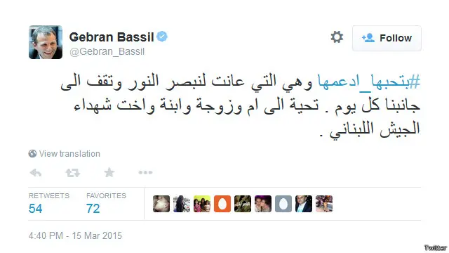 وكان من بين المغردين، وزير الخارجية اللبناني جبران باسيل، الذي ارسل تحياته إلى كل "ام وزوجة وابنة واخت شهداء الجيش اللبناني" في تغريدة له.